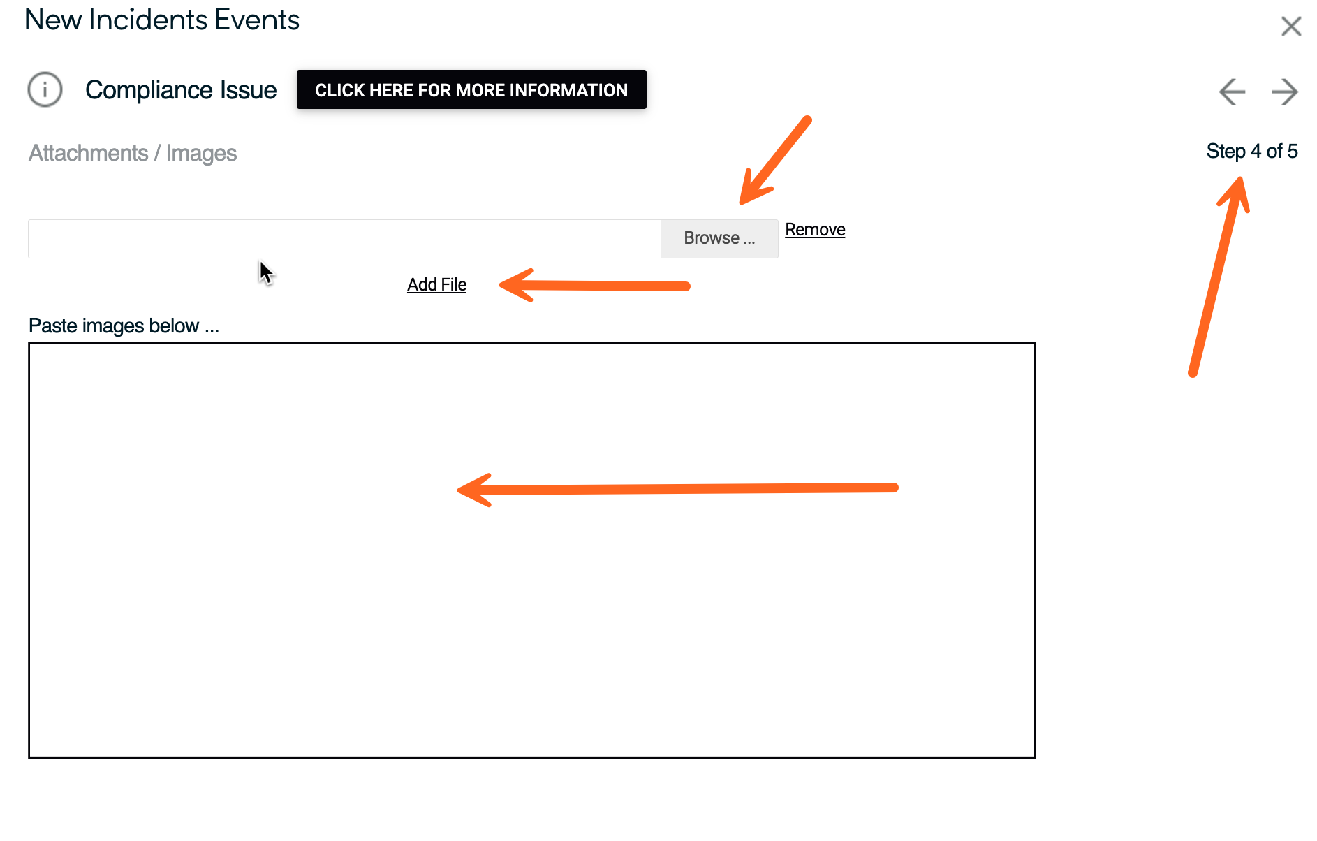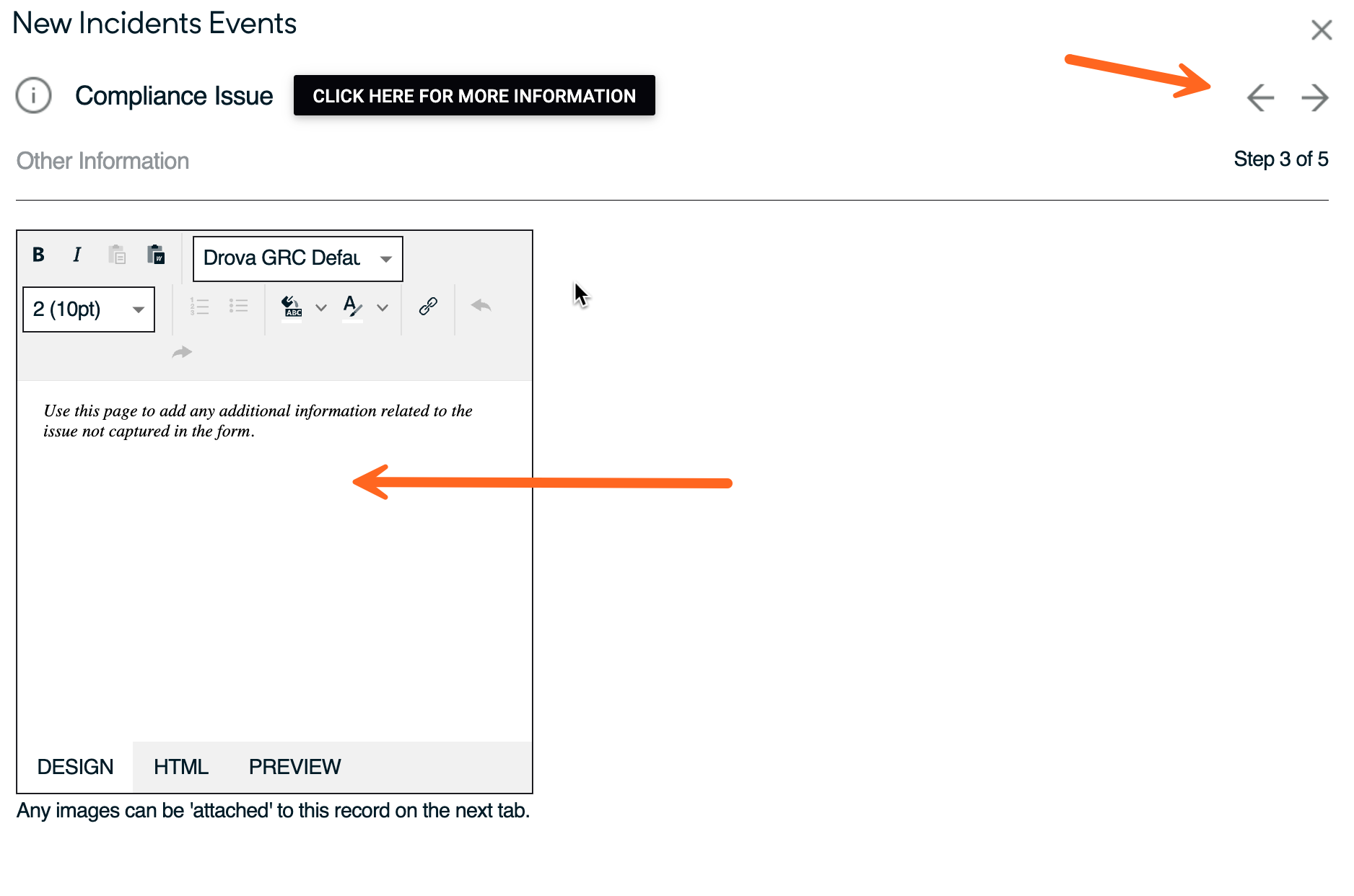Note this field is strictly a text field. If required, screen shots and other images can be added as attachments on the next page, step 4.