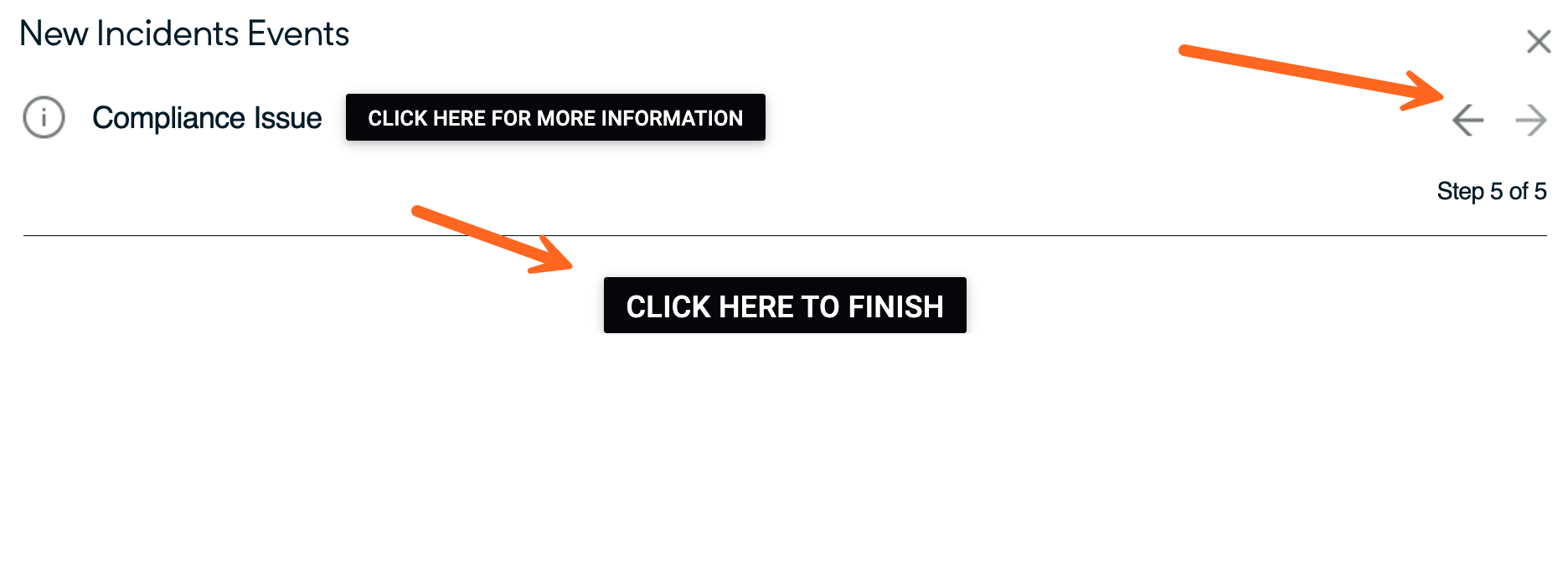 The final page appears (step 5 of 5). If required, click the Previous icon to review your Event information prior to finishing. Use the Next icon to return to this step.