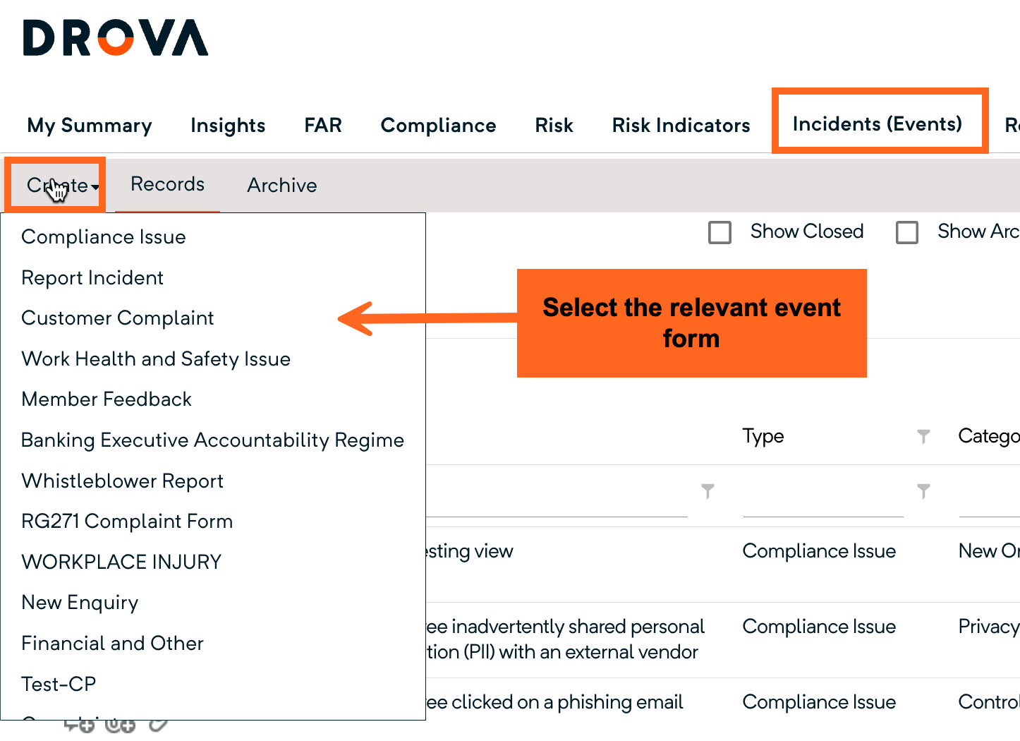 Drova GRC users can record an event record via the Main Menu. The different types of events that you may record entries for are displayed when you click the Create button.