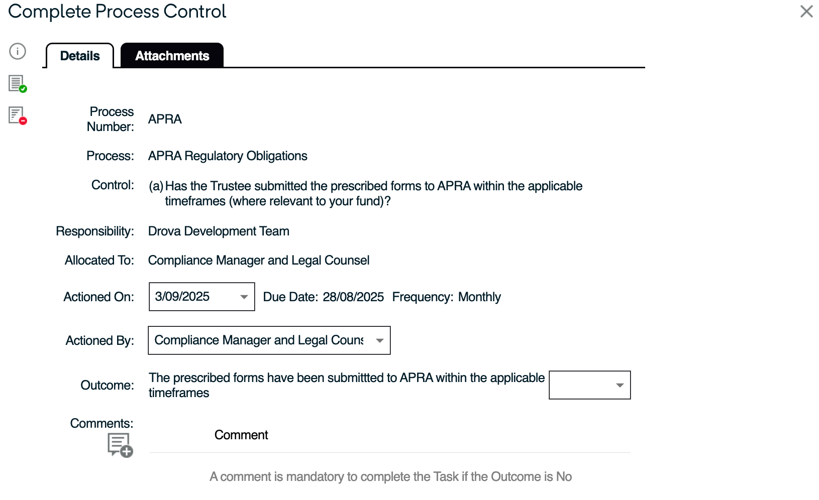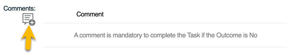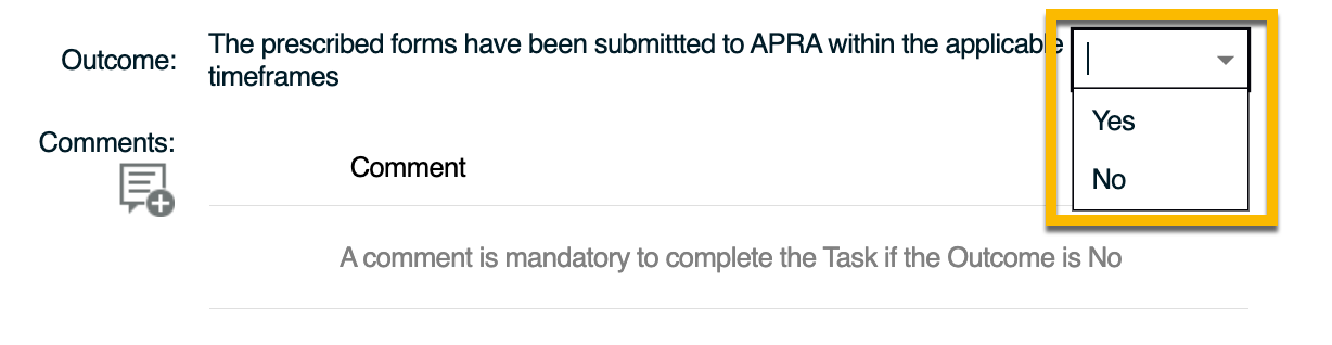 If the task has been setup as an Outcome task, read the Outcome question then select Yes/No or Pass/Fail . A selection of No or Fail will require a Comment to be added.