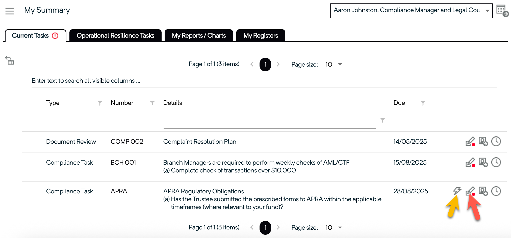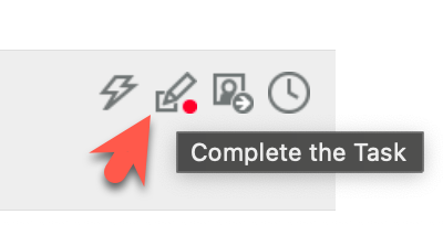 Depend on the task configuration and requirements, and the system configuration, you may have the option to Express complete (yellow arrow) the task. The pencil icon complete (red arrow) will always be available. Click one of these icons to complete the task. The Express complete icon will not appear if 1) the task is an attestation task, or 2) the task requires a comment, or 3) the task requires an attachment.