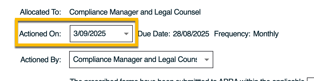 If you wish to change the date this task was Actioned On (or recorded on) from today to another date, select the new Actioned On date.