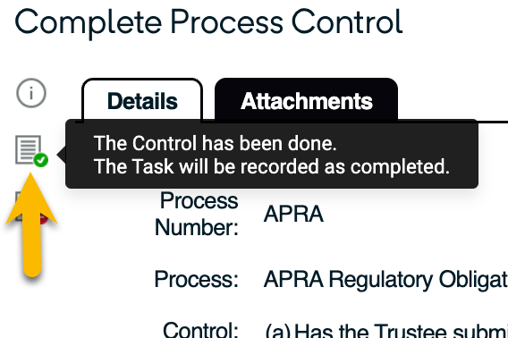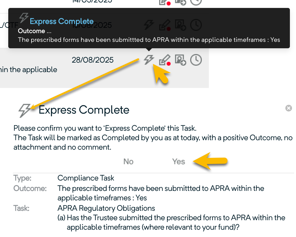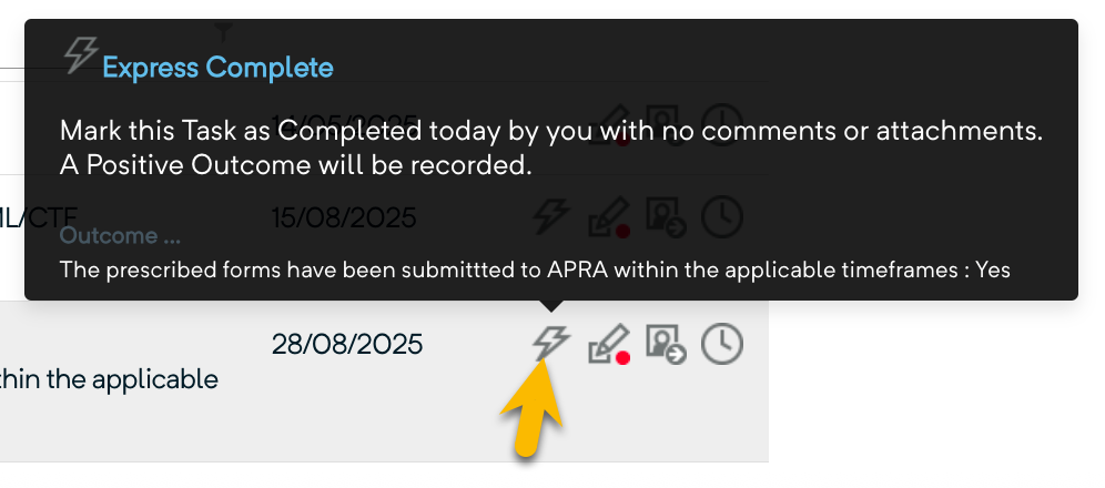 If you system is configured for single click express completion, clicking the Express Complete icon (yellow arrow), will complete. Hovering over the Express complete icon will display the information the task will complete with. If this task requires further amendments before competion, do not click this icon, click the pencil icon instead, to formally complete the task.