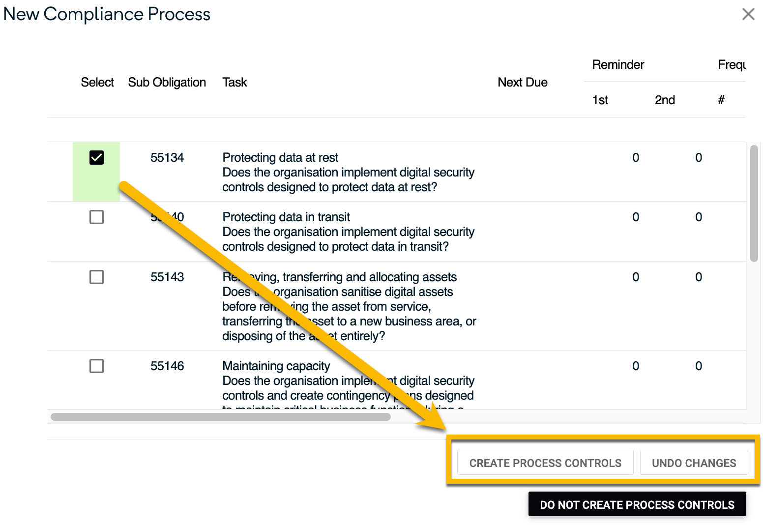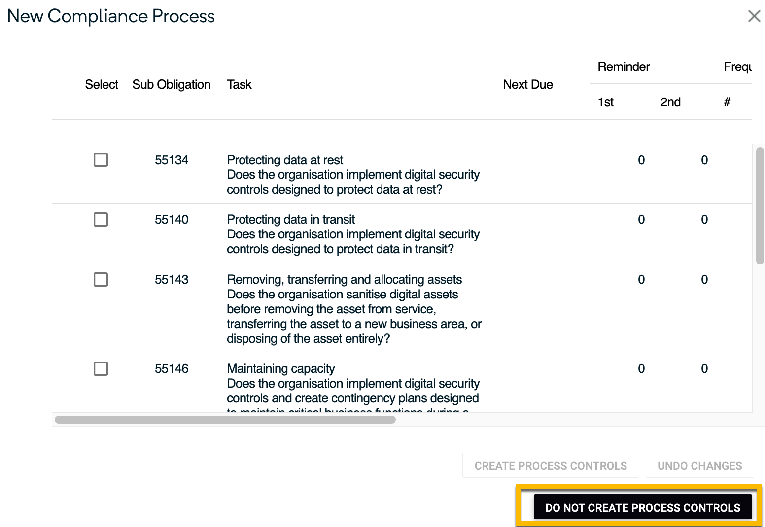 information will appear. If you choose not to select any Sub Obligation, click Do not create Process Controls