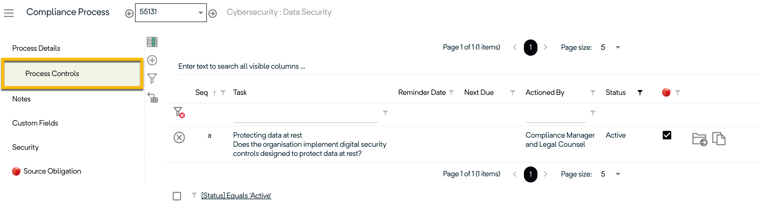 Creating a Process Controls from an Obligation Open an Obligation and click the Integration tab Click the Create a Process Control. The New Task window appears. Select the Compliance Process this new Process Control is created in. Searching of ...