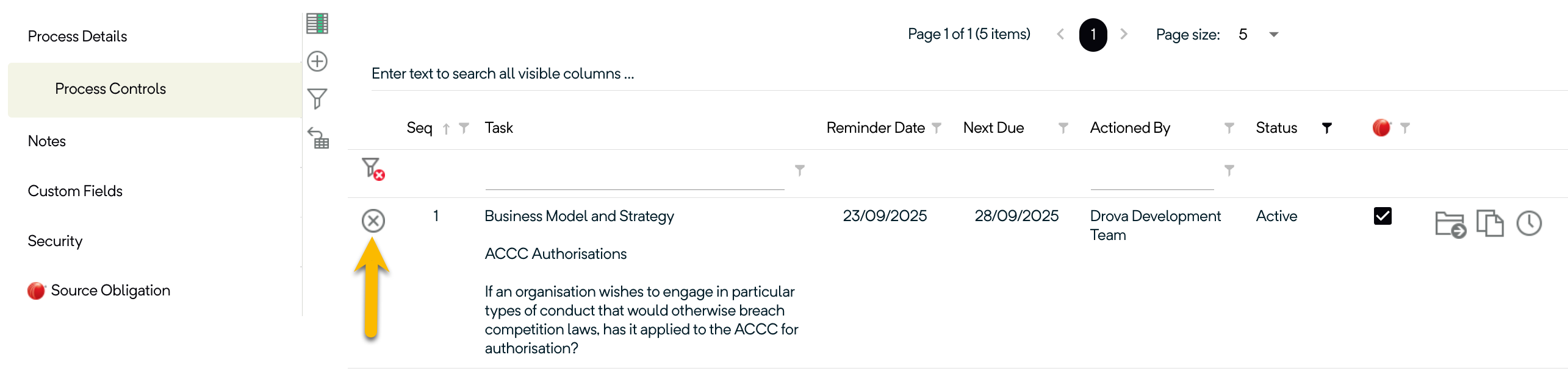 Click on a Compliance Process record in the list to open the The ‘Compliance Process’ page. Click the Process Control tab. Click the Delete