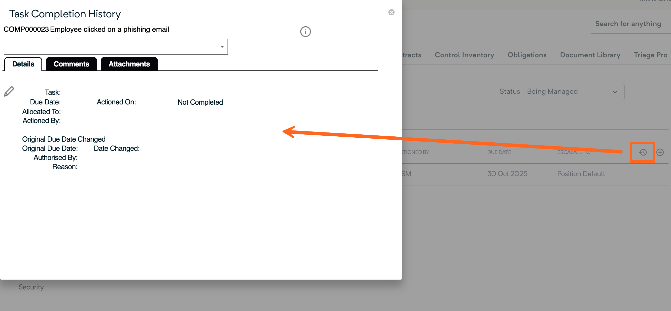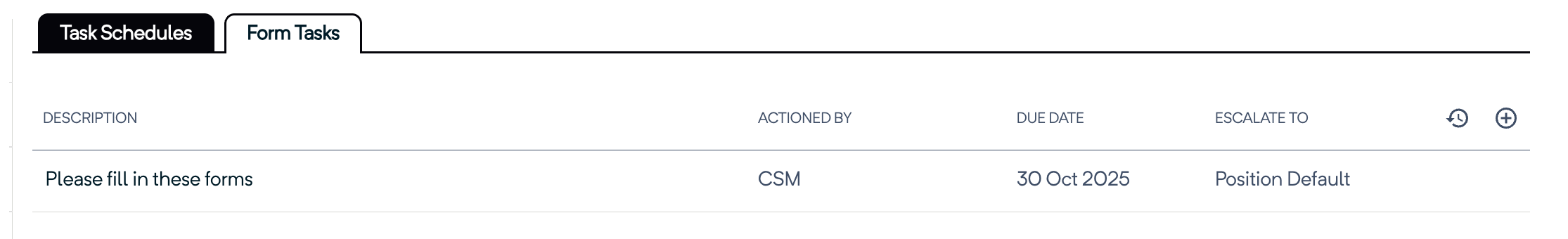 Once the task has been completed, the assigned form fields will be completed. This can be viewed within the Form Fields section of the record, or alternatively, to see the history, click the clock icon and a pop-up will appear.