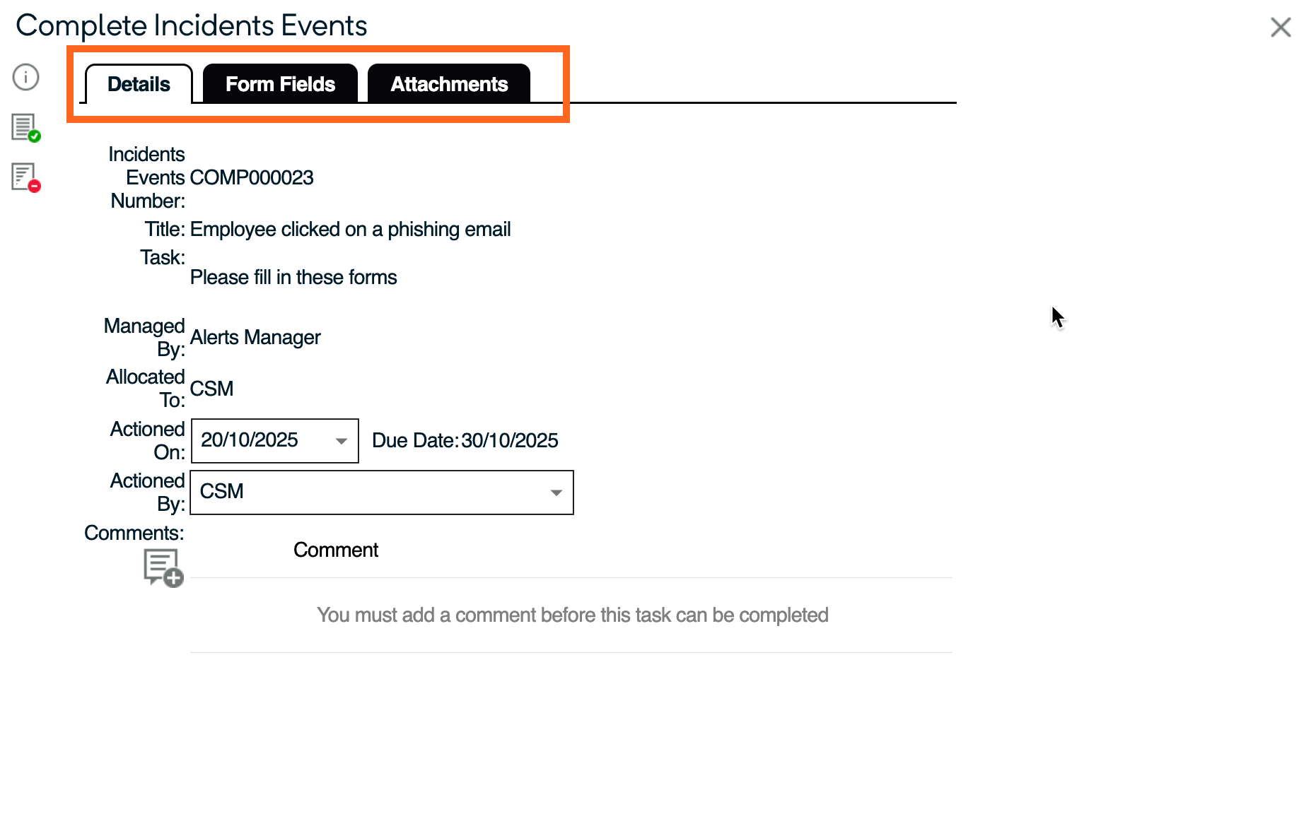 - Complete the information under Details and Form Fields, and where applicable, attach files under the Attachments tab.