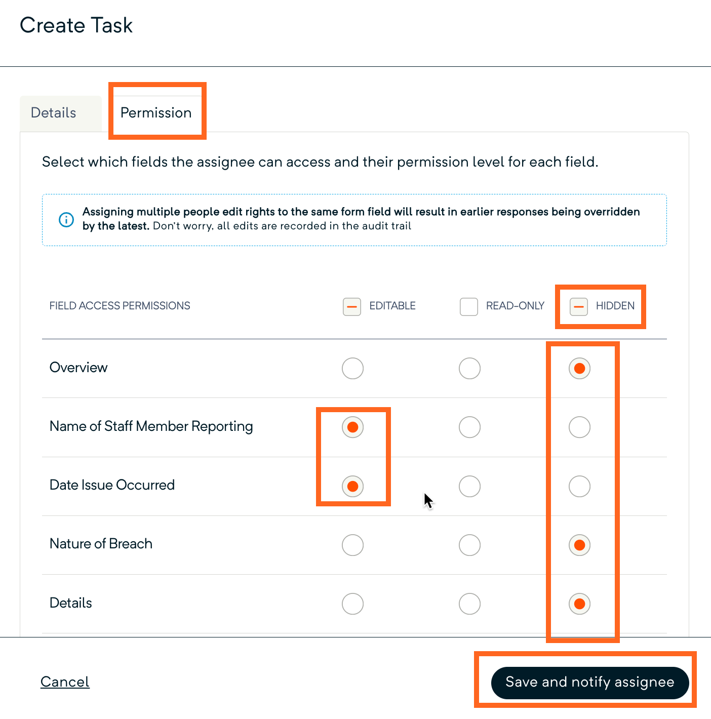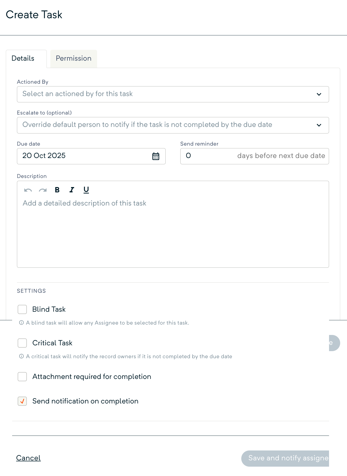 - Once all fields have been completed (on the Details and Permissions tab), the Save and notify assignee button will be highlighted.