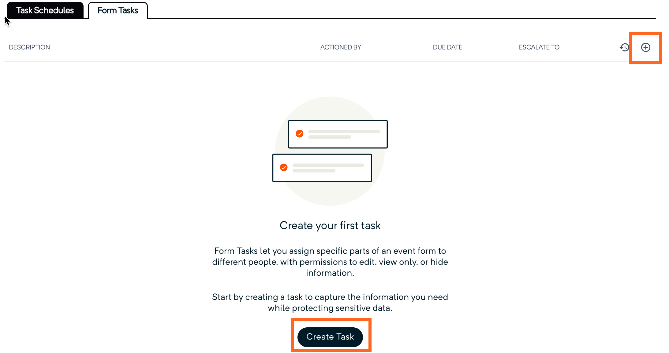 If this is the first time you are creating Form Tasks on this record, click the Create Task button. If you've already assigned Form Tasks, you can add additional tasks by clicking the + icon in the top right.