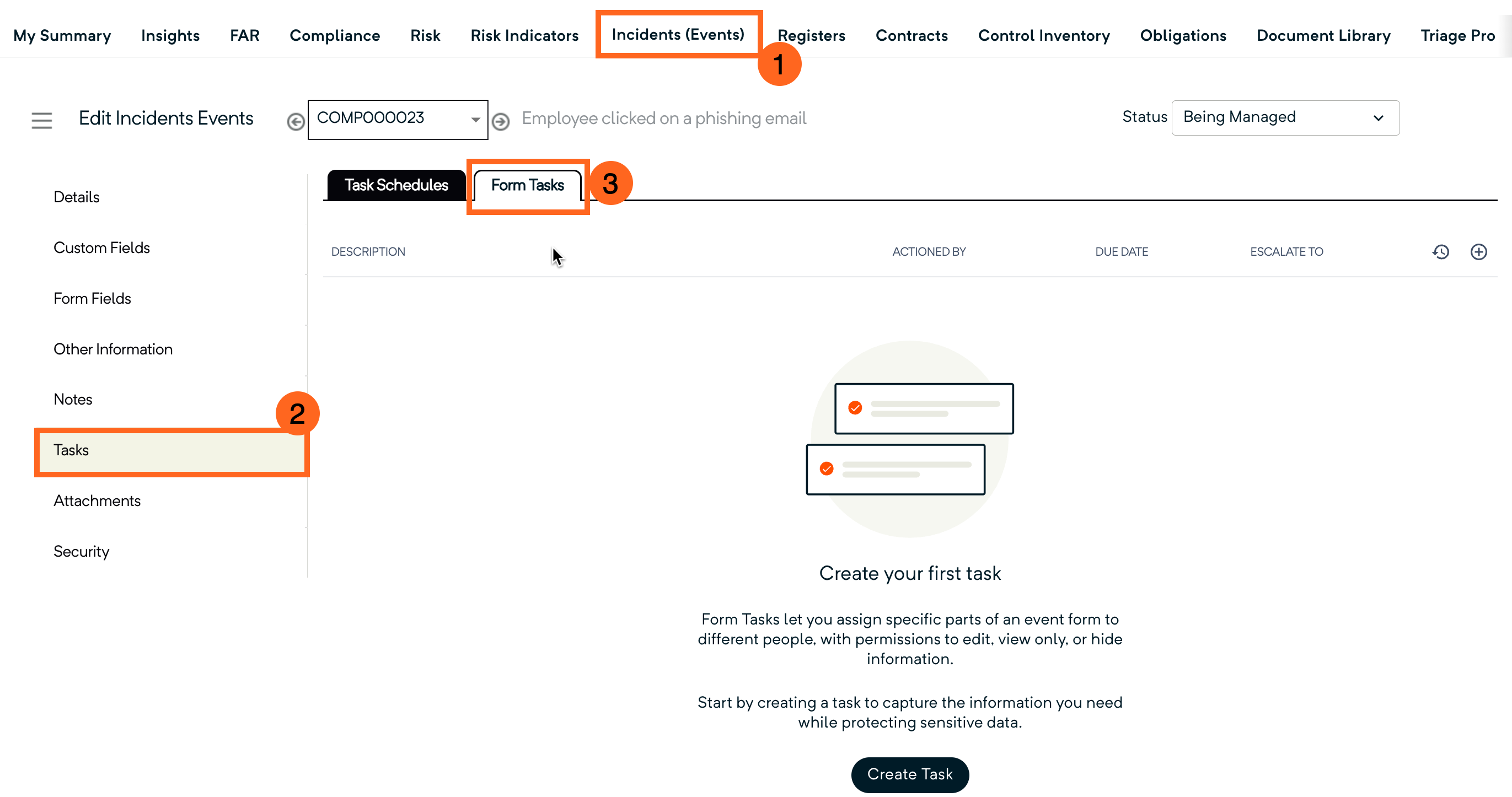 Adding (Scheduling) the KRI Task The KRI’s purpose is to record each measure as required. So, unlike a Compliance Process which can have multiple Process Control tasks, the KRI only has one task, record the measurement. Hence, the Task tab only ...