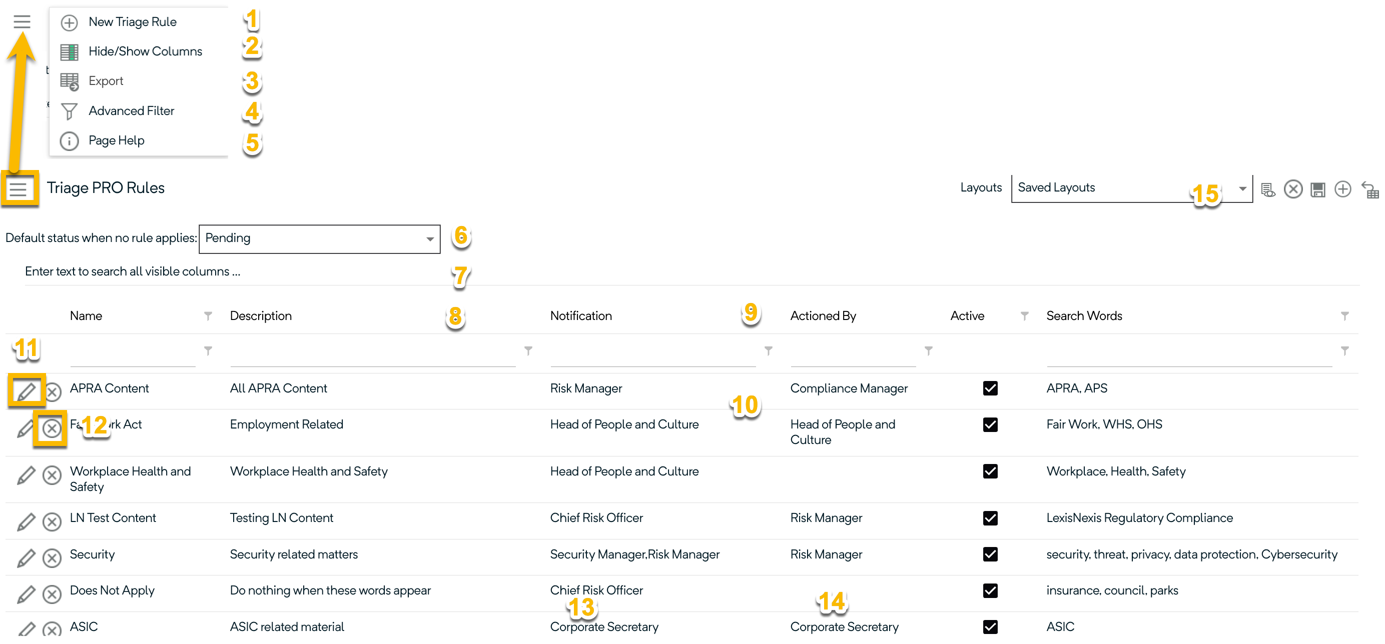 | 5 | Page Help icon | Click this icon to view basic information for working with the Triage PRO Rules page. |