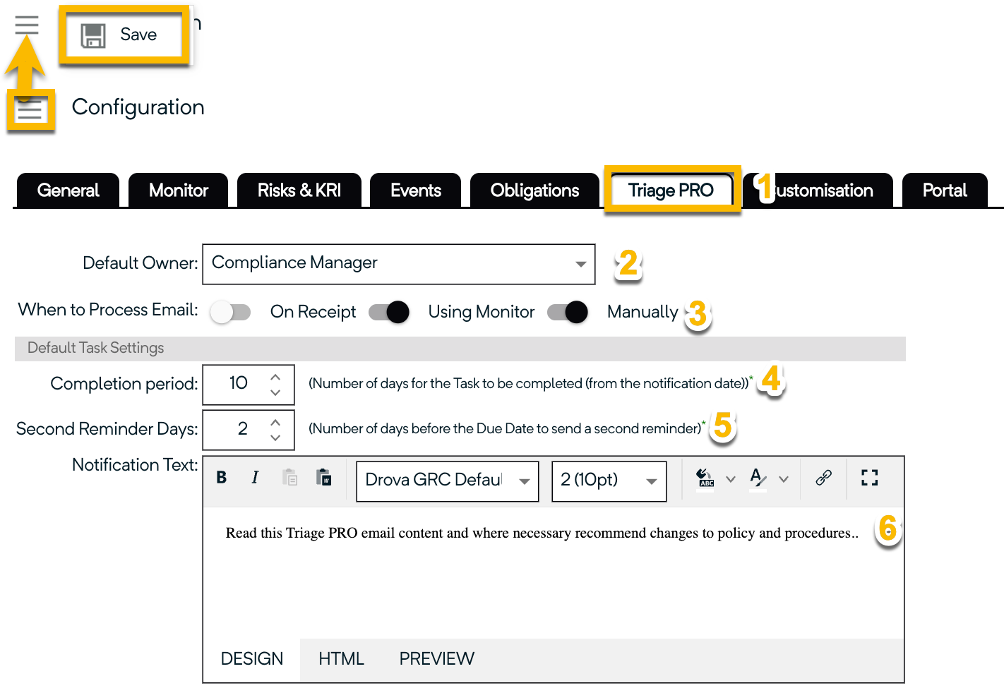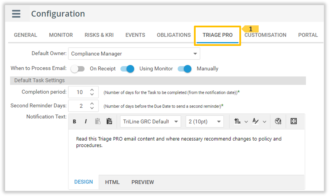 | 1 | ‘Triage PRO’ tab | Click this tab to display and edit the Obligations configuration settings. |