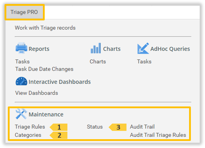 From the main menu, click or mouse hover over the Triage PRO menu to see the Maintenance menu items.