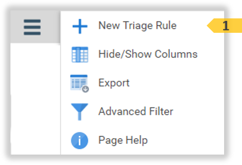On the ‘Triage PRO Rules’ page, hover over the Options Menu icon to display the options. Click the ‘New Triage Rule’ 1 icon.