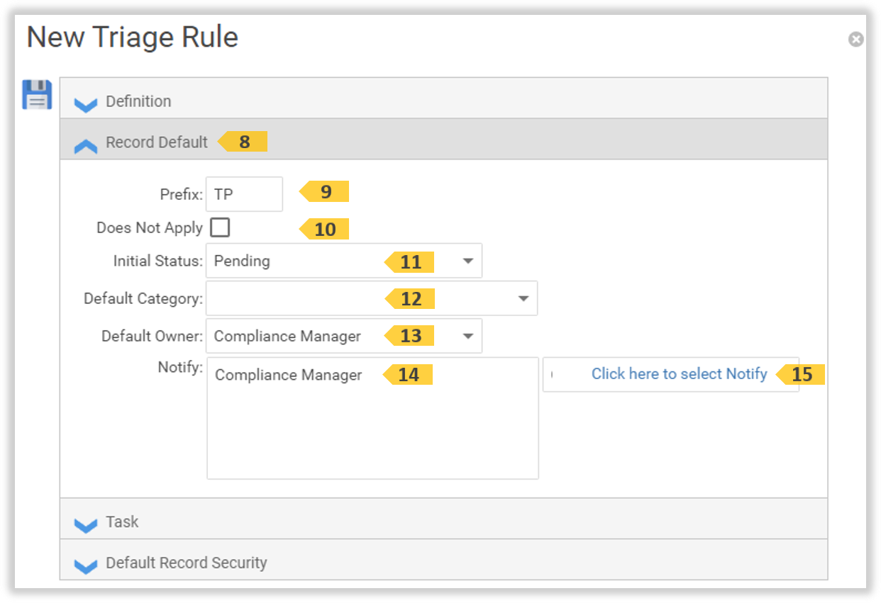 | 13 | ‘Default (Record) Owner’ selector | Select the Position to be the Default Owner of Triage PRO Records processed by this Rule. A Triage PRO record owner can be any Position in a Security Group with ‘Edit’ access to this record. |