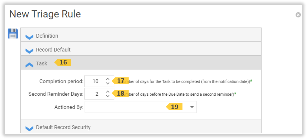 | 17 | ‘Completion Days’ field | Displays the number days the Task has to be completed from the day the Triage PRO record was processed by this Rule. Note: A task is only generated if the Actioned By 19 is selected. |