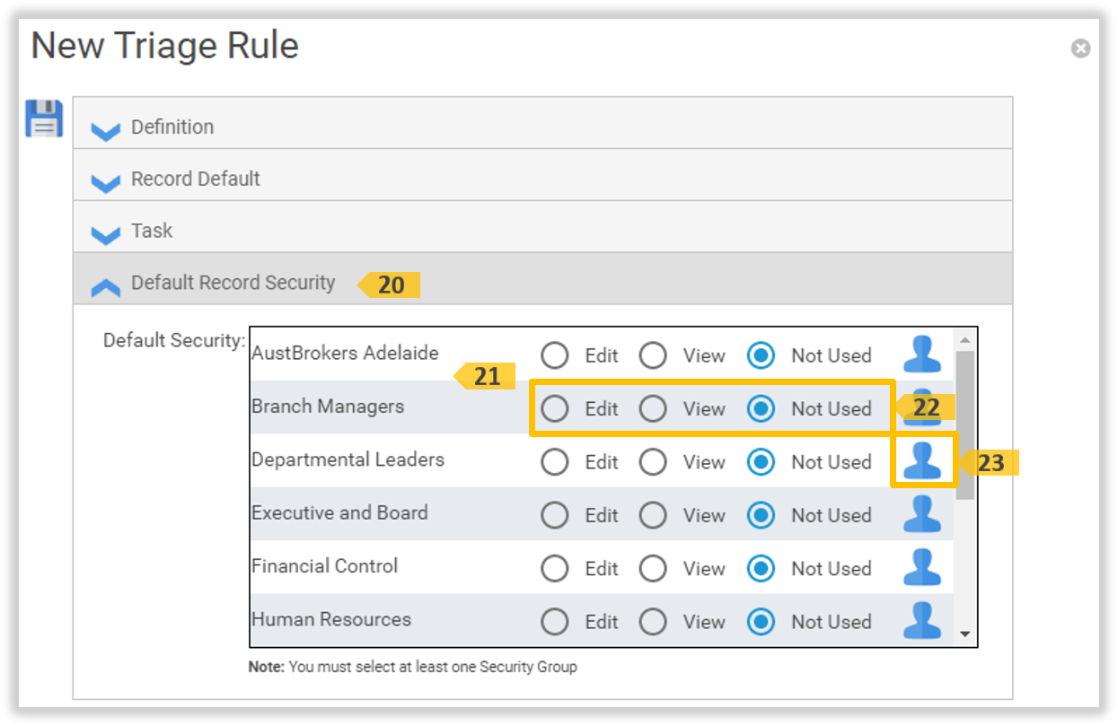 | 22 | Security Permissions Selector | Select a Record Security Rights level for the Security Group. |