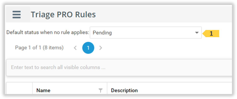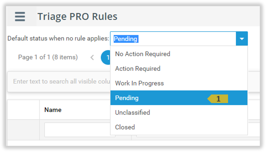 On the ‘Triage PRO Rule’ page, click the ‘Default status when no Rule applies’ 1 selector.