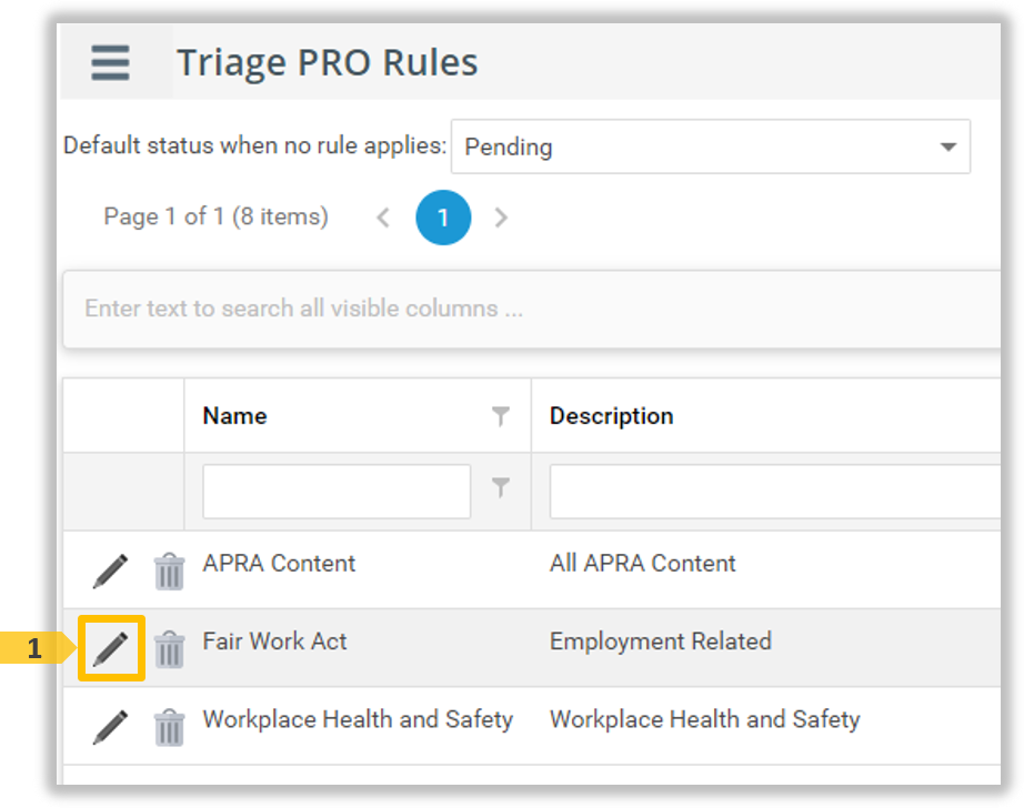 On the ‘Triage PRO Rule’ page, click the ‘Edit’ icon 1 of a Rule.