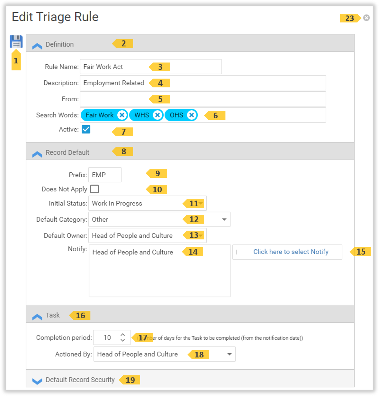 | 14 | ‘Notify’ list | Displays the list positions that will be notified when the Triage PRO record has this rule . This list usually includes the record Owner. |