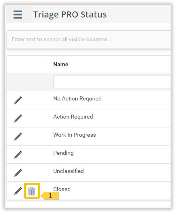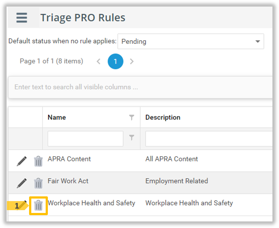 On the ‘Triage PRO Rule’ page, click the ‘Delete’ icon 1 of a Rule.
