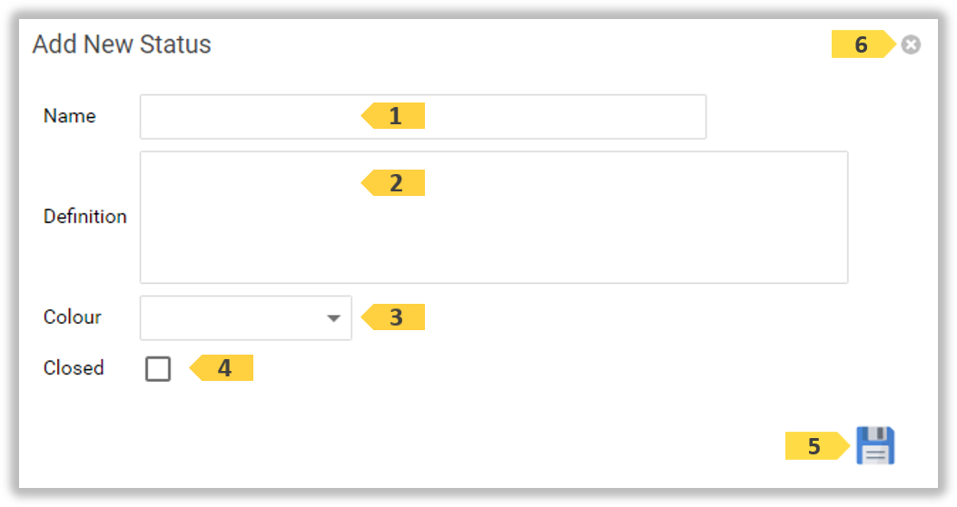 | 6 | ‘Close’ icon | Click this icon to close the ‘New Status’ window without adding a new Status. |