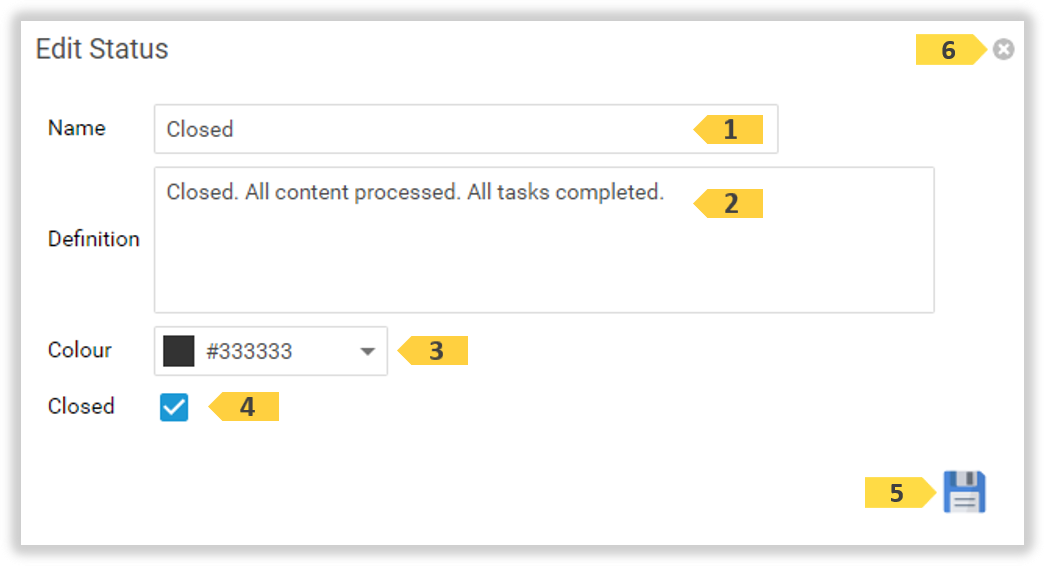 | 3 | ‘Colour’ selector | Select the colour to represent the Status. |