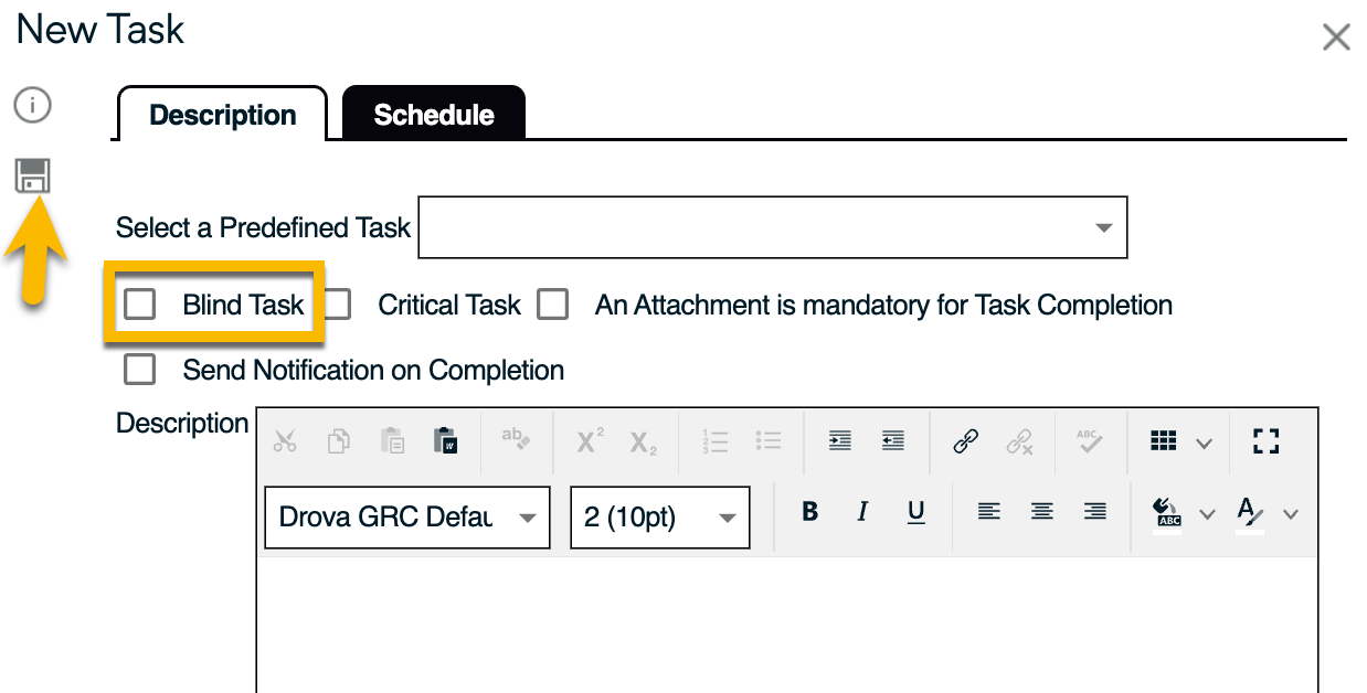 Click the ‘Save’ icon to create or update the Event Task. When this task is generated into a Current Task, it will be a blind Current Task.
