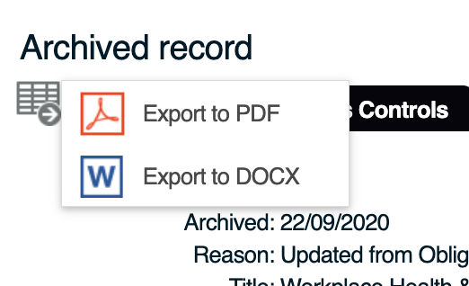 View details about the Archived Compliance record by clicking on the relevant tabs. Hover over the Export icon to display the export options.