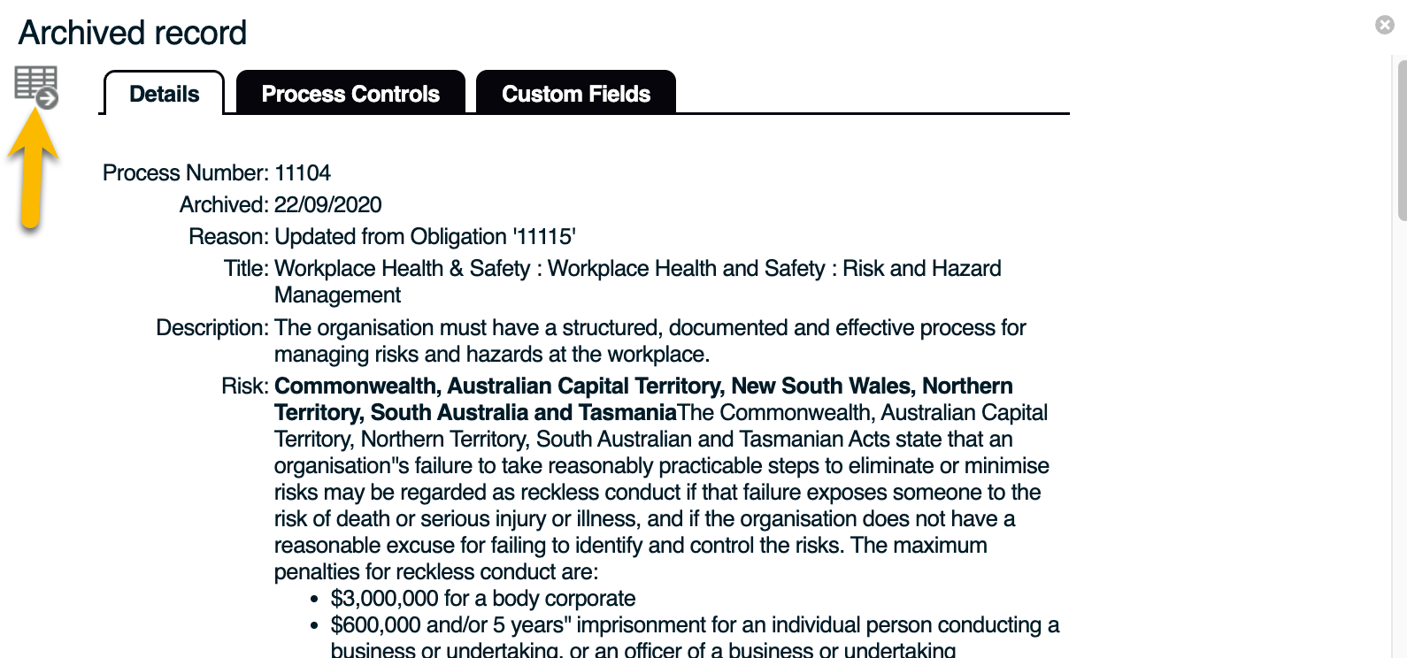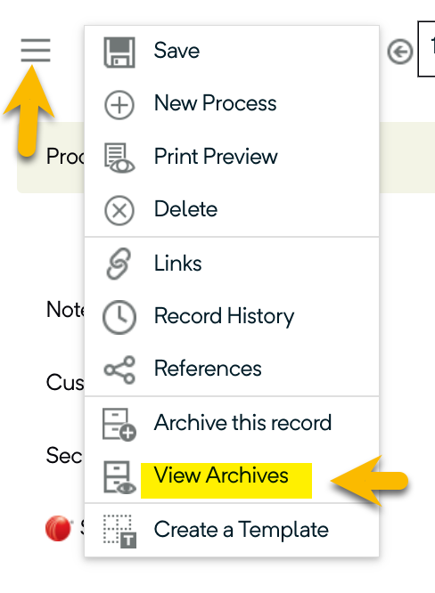 Click on a Compliance Process record in the list to open the The ‘Compliance Process’ page. From the Options menu, click the View Archives option.